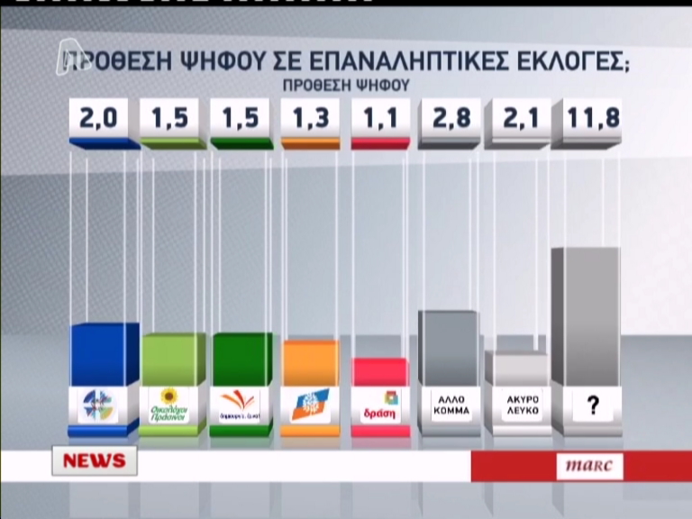Σύμφωνα με τη δημοσκόπηση της Marc για τον ALPHA, στην πρόθεση ψήφου σε περίπτωση επαναληπτικών εκλογών, ο ΣΥΡΙΖΑ συγκεντρώνει 23,8% με τη ΝΔ να έρχεται δεύτερο κόμμα με ποσοστό 17,4%. Πτώση εμφανίζει στην πρόθεση ψήφου και το ΠΑΣΟΚ με 10,8% στην πρόθεση ψήφου. Ακολουθούν οι Ανεξάρτητοι Έλληνες με 8,7%, μειωμένα είναι τα ποσοστα του ΚΚΕ και της ΔΗΜ.ΑΡ. που συγκεντρώνουν 6% και 4,2% αντίστοιχα.Μείωση εμφανίζει και η Χρυσή Αυγή με ποσοστό 4,9%.Είναι χαρακτηριστικό ότι το 11,8% είναι αναποφάσιστοι. Επίσης, είναι ενδεικτικό ότι στην πρόθεση ψήφου, ο ΣΥΡΙΖΑ κερδίζει το 19,3% των ψηφοφόρων κομμάτων που δεν κατάφεραν να μπουν στη βουλή και το 8% των ψηφοφόρων της Χρυσής Αυγής.