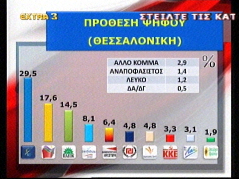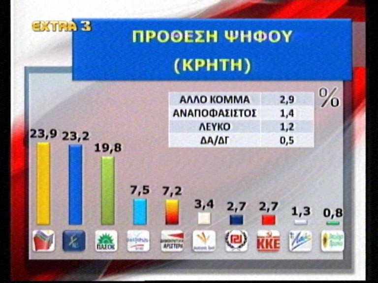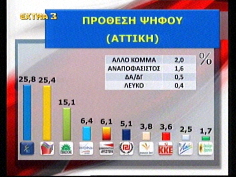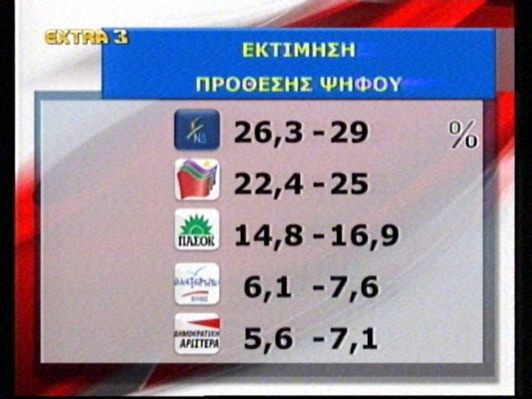 Προβάδισμα της ΝΔ με 27,7% έναντι του ΣΥΡΙΖΑ που συγκεντρώνει 23,7% δείχνει η δημοσκόπηση του Καθηγητή Επαμεινώνδα Πανά και της ομάδας του από το τμήμα Στατιστικής του Οικονομικού Πανεπιστημίου Αθηνών, η οποία παρουσιάστηκε στο EXTRA 3 στο Αποκαλυπτικό Δελτίο με τον Άκη Παυλόπουλο.Στην πρόθεση ψήφου ακολουθεί το ΠΑΣΟΚ με 15,8%, οι Ανεξάρτητοι Έλληνες με 6,9%, η Δημοκρατική Αριστερά με 6,3% και η Χρυσή Αυγή με 5%. Σύμφωνα με τη δημοσκόπηση, στη βουλή μπαίνει η Δημιουργία Ξανά με 3,3%, ενώ το ΚΚΕ συγκεντρώνει ποσοστό μόλις 3,2%. Εκτός, μένει ο ΛΑΟΣ με 2,4%, ενώ αναποφάσιστο δηλώνει το 1,4%. Στην εκτίμηση της πρόθεσης ψήφου, η ΝΔ καταγράφει 26,3-29%, ενώ ο ΣΥΡΙΖΑ 22,4%-25%.