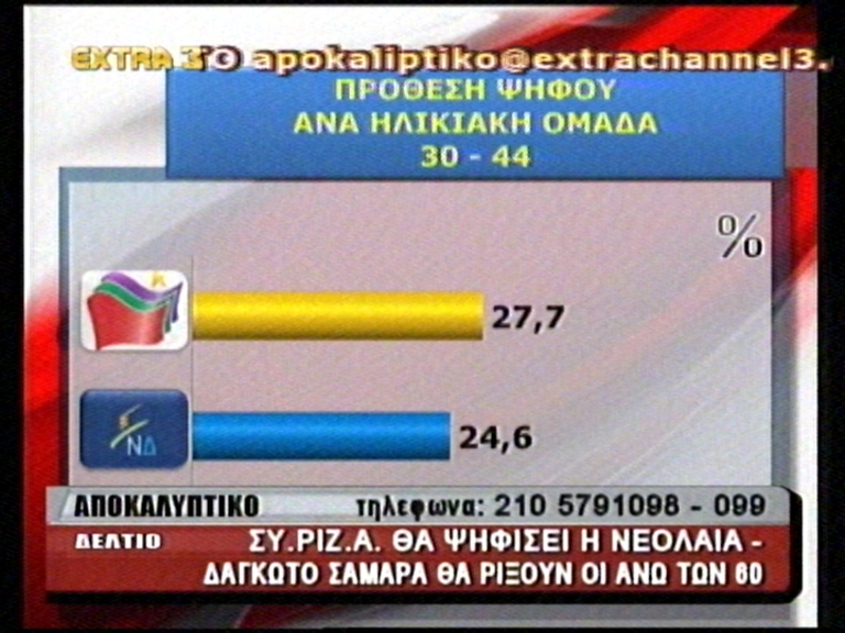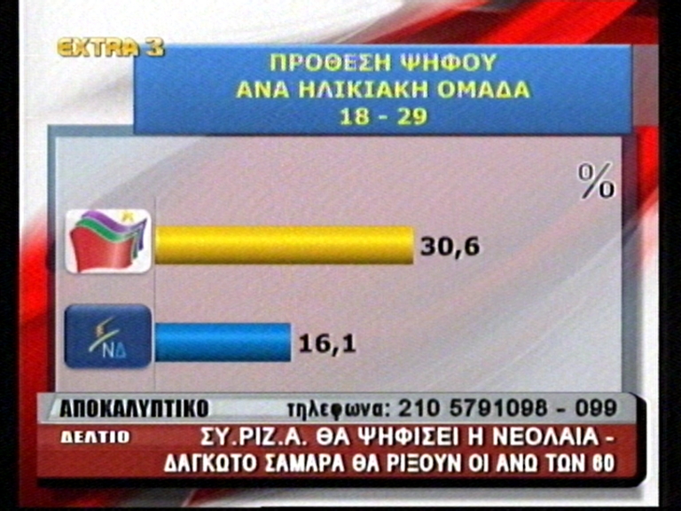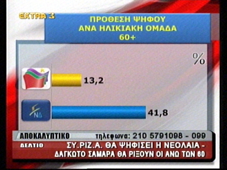 Πρόθεση ψήφου ανά ηλικιακή ομάδα Στην πρόθεση ψήφου ανά ηλικιακή ομάδα, προκύπτει ότι η νεολαία ψηφίζει ΣΥΡΙΖΑ, ενώ οι ηλικίες άνω των 60 “δαγκωτό” ΝΔ. Συγκεκριμένα στην ηλικιακή ομάδα 18-29, ο ΣΥΡΙΖΑ προηγείται με 30,6% έναντι 16,1% της ΝΔ. Κοντά βρίσκονται τα δύο κόμματα στην ηλικιακή ομάδα 30-44, όμως στις ηλικίες άνω των 60 η ΝΔ προηγείται με 41,8% και ο ΣΥΡΙΖΑ έπεται με 13,2%.