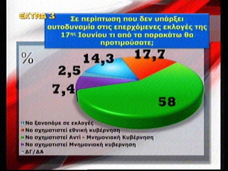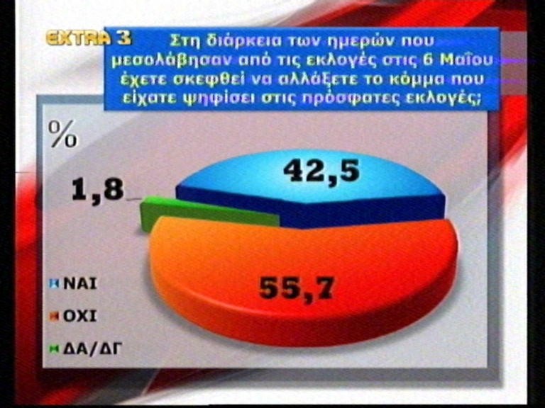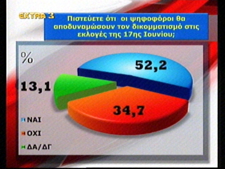Τέλος, το 52,2% των ερωτηθέντων πιστεύει ότι οι ψηφοφόροι θα αποδυναμώσουν τον δικομματισμό (εννοώντας ΠΑΣΟΚ-ΝΔ) στις εκλογές της 17ης Ιουνίου.
