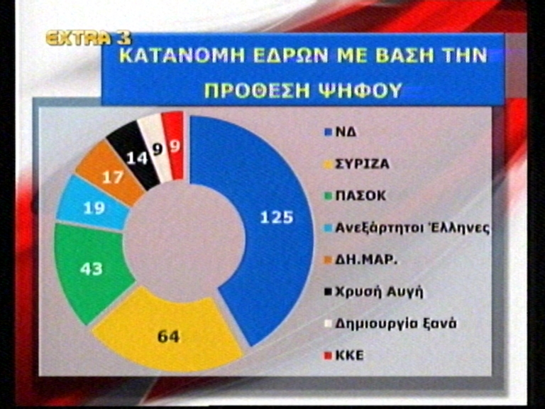 Με βάση την πρόθεση ψήφου, στην κατανομή εδρών η ΝΔ καταλαμβάνει 125 έδρες, ο ΣΥΡΙΖΑ 64, το ΠΑΣΟΚ 43, οι Ανεξάρτητοι Έλληνες 19, η ΔΗΜΑΡ 17, η Χρυσή Αυγή 14, η Δημιουργία Ξανά και το ΚΚΕ από 9.