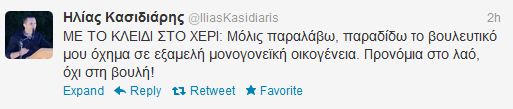 Την πρόθεσή του να μην κάνει χρήση του βουλευτικού του οχήματος εξέφρασε μέσω Twitter ο εκπρόσωπος της Χρυσής Αυγής Ηλίας Κασιδιάρης. Μάλιστα, όπως έγραψε μόλις το παραλάβει θα το παραχωρήσει.”ΜΕ ΤΟ ΚΛΕΙΔΙ ΣΤΟ ΧΕΡΙ: Μόλις παραλάβω, παραδίδω το βουλευτικό μου όχημα σε εξαμελή μονογονεϊκή οικογένεια. Προνόμια στο λαό, όχι στη βουλή!”, έγραψε στο Twitter του ο κ. Κασιδιάρης.