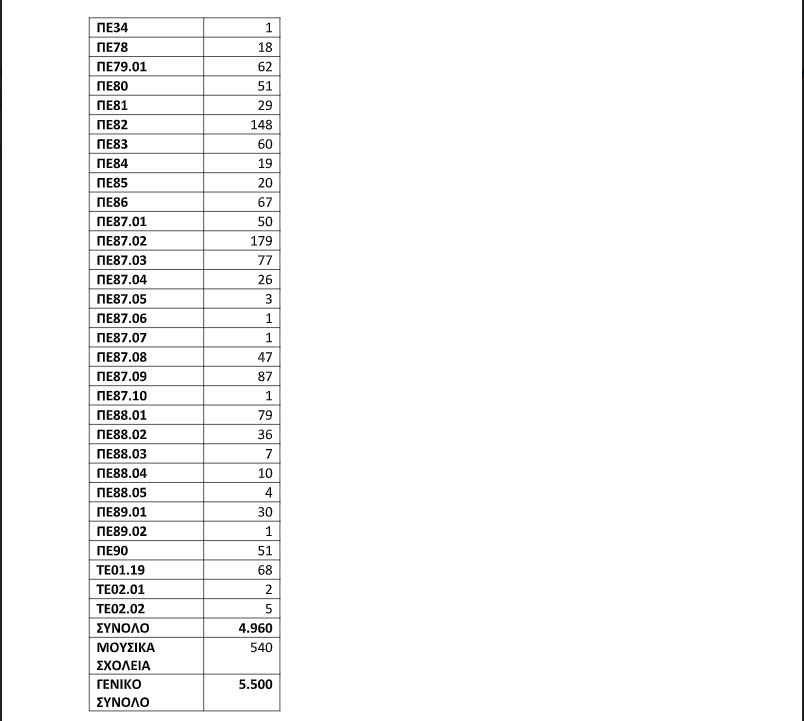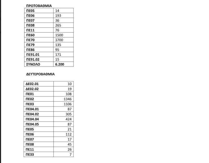 Η κατανομή των εκπαιδευτικών που θα προσληφθούν άμεσα για το σχολικό έτος που αρχίζει το Σεπτέμβριο έχει ως εξής: