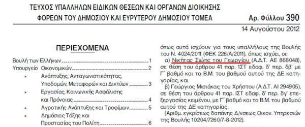 Επίσης, όπως φαίνεται στο ΦΕΚ (τεύχος ΥΟΔΔ) 390/14-08-2012, διορίζονται σε κενές οργανικές θέσεις οι: