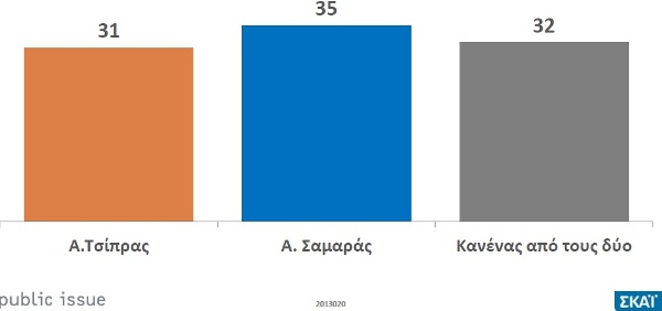 Στην ερώτηση «ανάμεσα στον Αλέξη Τσίπρα και στον Αντώνη Σαμαρά, ποιος θα λέγατε ότι είναι ο καταλληλότερος για πρωθυπουργός της χώρας, ο Αντώνης Σαμαράς, ή ο Αλέξης Τσίπρας;», τον Αντώνη Σαμαρά επιλέγει το 35% των ερωτηθέντων (41% τον Ιούλιο) και τον Αλέξη Τσίπρα το 31% (30% τον Ιούλιο). Κανέναν από τους δύο απαντάει το 32% των ερωτηθέντων (27%).