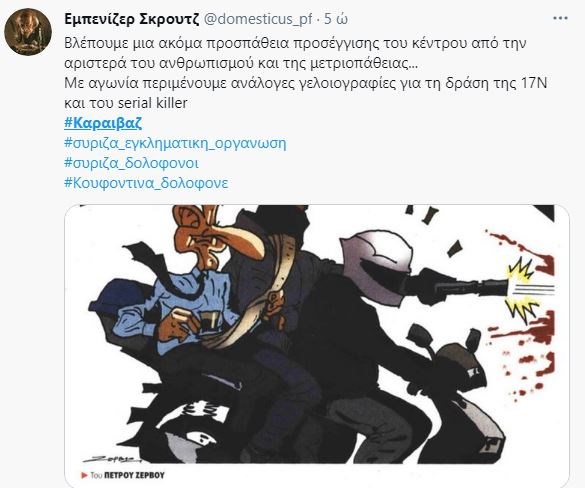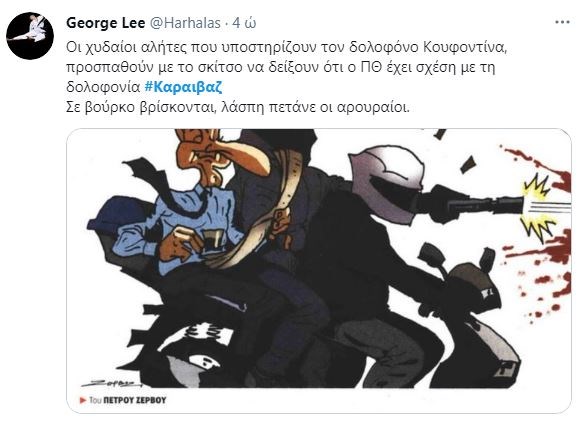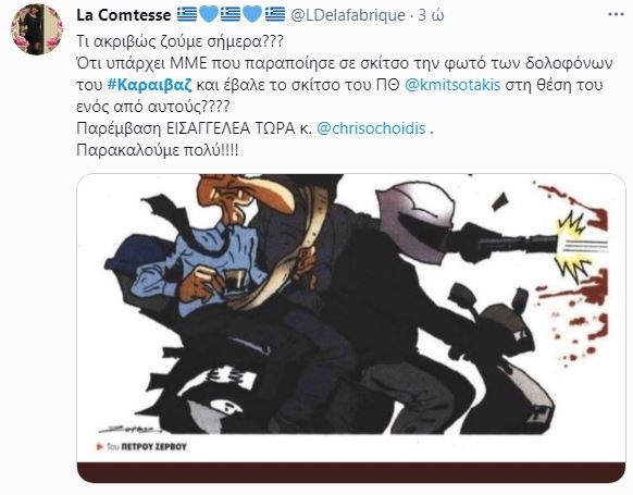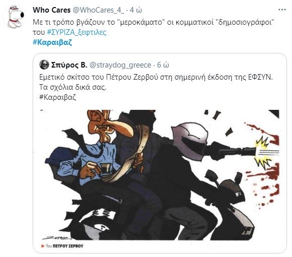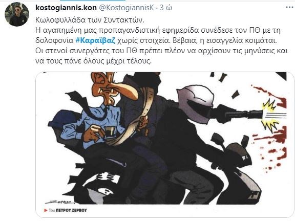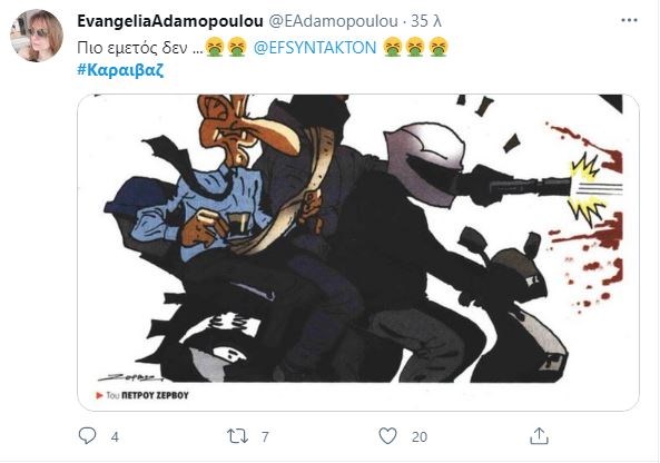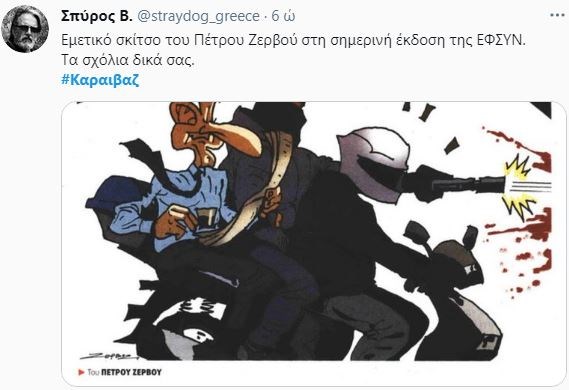 Την αντίδραση της κυβερνητικής εκπροσώπου, αλλά και χρηστών των social media, έχει προκαλέσει ένα σκίτσο που δημοσίευσε σήμερα η “Εφημερίδα των Συντακτών”, σχετικά με τη δολοφονία του Γιώργου Καραϊβάζ. Ο αστυνομικός συντάκτης έπεσε νεκρός από τα πυρά δύο εκτελεστών, που του έστησαν καρτέρι έξω από το σπίτι του στον Άλιμο, το μεσημέρι της Παρασκευής.