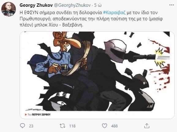 Στο σκίτσο που δημοσιεύει η εφημερίδα, απεικονίζεται ο Κυριάκος Μητσοτάκης να επιβαίνει στο μηχανάκι των δύο εκτελεστών του δημοσιογράφου και ενώ ένας εξ’ αυτών πυροβολεί και σκοτώνει τον Γιώργο Καραϊβάζ, ο Πρωθυπουργός εμφανίζεται να πίνει καφέ και να διαβάζει εφημερίδα. Πρόκειται για σκίτσο του Πέτρου Ζερβού.