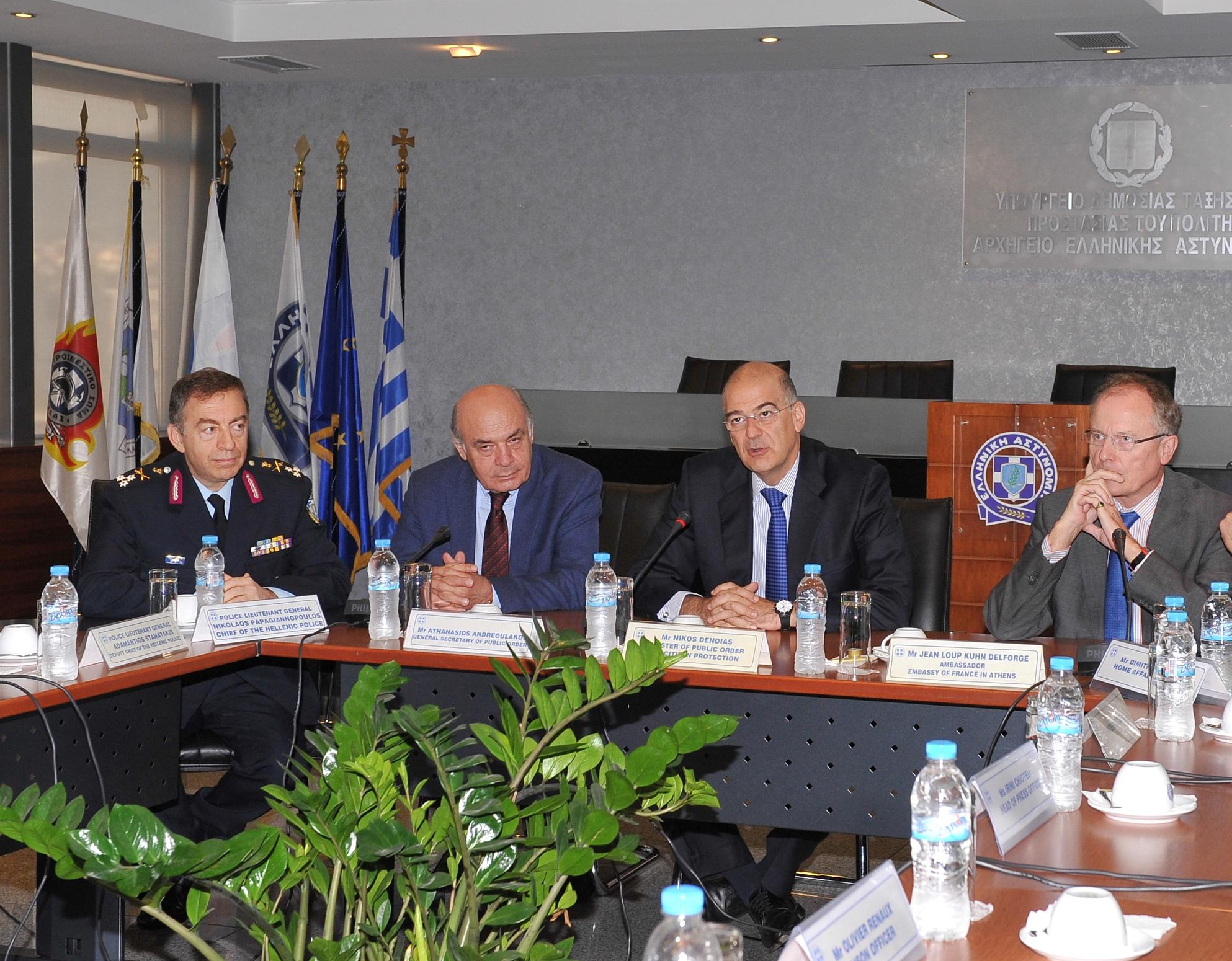 Από την πλευρά του ο Πρέσβης της Γαλλίας στη χώρα μας κ. Jean Loup Kuhn – Delforge ανέφερε μεταξύ άλλων πως «Αποτελεί όμως, θα ήθελα να σας βεβαιώσω κ. Υπουργέ και τη διαβεβαίωση από την πλευρά της Κυβέρνησής μου ότι η ελληνική πλευρά κάνει ό,τι μπορεί για τη διασφάλιση του χώρου Schengen και της ασφάλειας στον ευρωπαϊκό χώρο, στην Ευρώπη. Έχουμε ενταχθεί πρόσφατα στην πρωτοβουλία της Μάλτας μαζί με τον Πρωθυπουργό τον κ. Σαμαρά και εσάς τον ίδιο, κάτι το οποίο σηματοδοτεί τις κοινές θέσεις που έχουμε σε πολλά θέματα και κυρίως σε θέματα μετανάστευσης, συμπεριλαμβανομένου και ενός νέου καθεστώτος ασύλου που είναι σημαντικό τόσο για σας, όσο και για μας. Γνωρίζουμε πολύ καλά ότι η Ελληνική Αστυνομία βρίσκεται στην εμπροσθοφυλακή της Ευρωπαϊκής Αστυνομίας και είμαστε σίγουροι για τις προσπάθειες που καταβάλλει η Ελληνική Αστυνομία προκειμένου να εξασφαλιστεί η ασφάλεια των πολιτών μας απέναντι στις απειλές της τρομοκρατίας και του οργανωμένου εγκλήματος, της παράνομης μετανάστευσης και των διεθνικών κυκλωμάτων εγκληματικότητας».