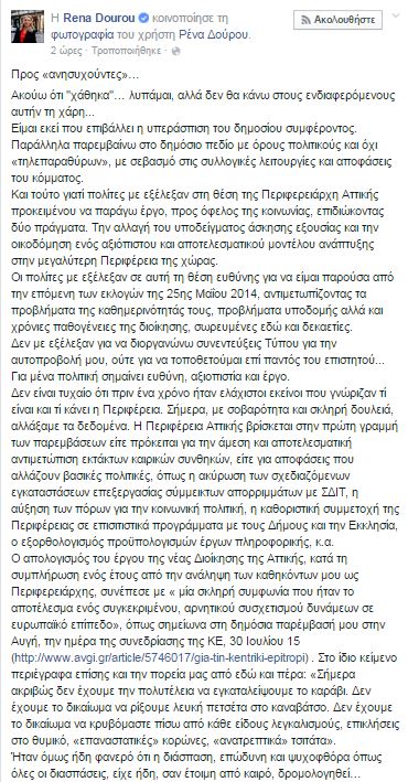 Με ανάρτηση στον προσωπικό της λογαριασμό στο Facebook απάντησε η Περιφερειάρχης Αττικής, Ρένα Δούρου, σε όσους «ανησυχούν» ότι χάθηκε, επισημαίνοντας δεν θα κάνει στους ενδιαφερόμενους αυτή τη χάρη. Διαβάστε αναλυτικά όσα έγραψε στο Facebook.