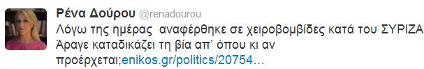 Τα όσα ανέφερε ο Πρωθυπουργός Αντώνης Σαμαράς στους βουλευτές της Νέας Δημοκρατίας αναφορικά με τον ΣΥΡΙΖΑ, σχολιάζει, μέσω twitter η Ρένα Δούρου.