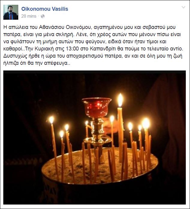 «Η απώλεια του Αθανάσιου Οικονόμου, αγαπημένου μου και σεβαστού μου πατέρα, είναι για μένα σκληρή. Λένε, ότι χρέος αυτών που μένουν πίσω είναι να φυλάττουν τη μνήμη αυτών που φεύγουν, ειδικά όταν ήταν τίμιοι και καθαροί.Την Κυριακή στις 13:00 στο Καπανδρίτι θα πούμε το τελευταίο αντίο. Δυστυχώς ήρθε η ώρα του αποχαιρετισμού πατέρα, αν και σε όλη μου τη ζωή ήλπιζα ότι θα την απέφευγα», έγραψε ο βουλευτής της Νέας Δημοκρατίας στον προσωπικό του λογαριασμό στο μέσο κοινωνικής δικτύωσης.