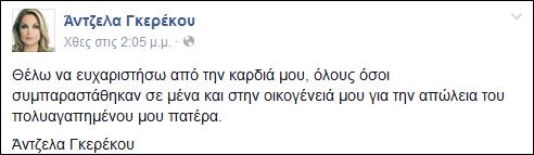 Σημειώνεται ότι ο πατέρας της Άντζελας Γκερέκου, έφυγε από τη ζωή το Σάββατο από ανακοπή καρδιάς. Η κηδεία του έγινε στον Ι.Ν. Αγ. Τριάδος στο Κοντόκαλι.
