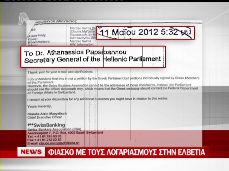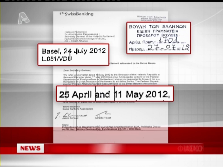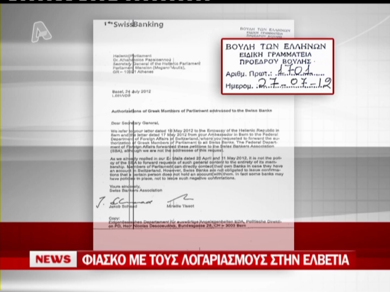 Σε πολιτικό φιάσκο κατέληξε η πολυδιαφημισμένη προσπάθεια να εντοπιστούν και να ανοίξουν οι τραπεζικοί λογαριασμοί Ελλήνων βουλευτών στην Ελβετία. Η βουλή ενημέρωσε ότι το αίτημά της απορρίφθηκε, μόνο που η απόρριψη δεν έγινε σήμερα, αλλά πριν από δυο μήνες.Τα παρακάτω έγγραφα δειχνουν ότι η Βουλή γνώριζε εδώ και πολύ καιρό την απόρριψη του αιτήματος και μάλιστα σε συγκεκριμένες φάσεις είχε λάβει ενημερώσεις από τις Ελβετικές Αρχές.Στις 4 Απριλίου, όπως θα δείτε στο έγγραφο, ο τότε αντιπρόεδρος και αρμόδιος Επιτροπής, κ. Αργύρης, έστειλε στους Ελβετούς τις 233 εξουσιοδοτήσεις των βουλευτών, οι οποίοι ζητούσαν να ελεχθεί αν υπάρχουν λογαριασμοί τους στην χώρα.