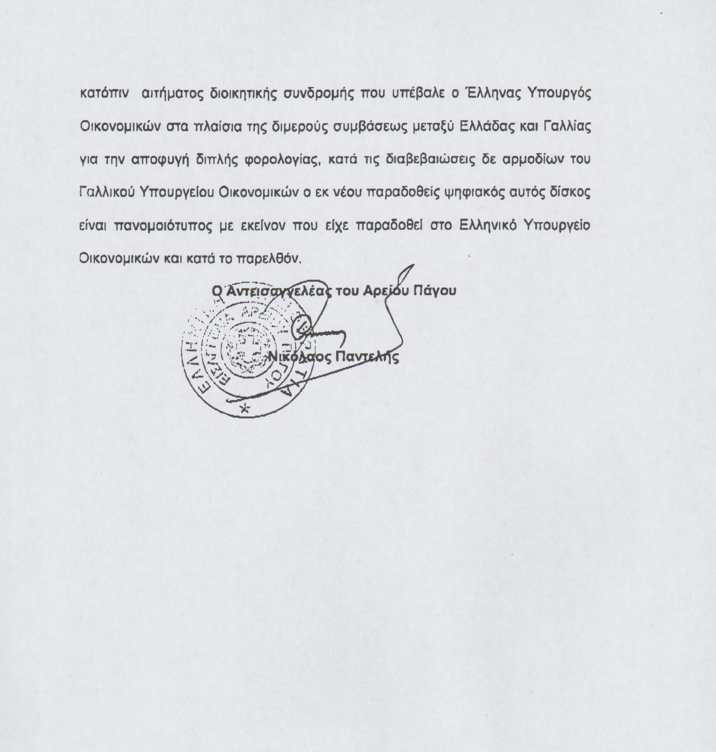 Ακολουθεί το έγγραφο του αντεισαγγελέα του Αρείου Πάγου Νίκο Παντελή προς τον πρόεδρο της Βουλής, με το οποίο διαβιβάζει «δια του κ. υπουργού Δικαιοσύνης» Αντώνη Ρουπακιώτη, διαβιβάζει την αξιολόγηση των δύο οικονομικών εισαγγελέων Γρηγόρη Πεπόνη και Σπύρου Μουζακίτη.