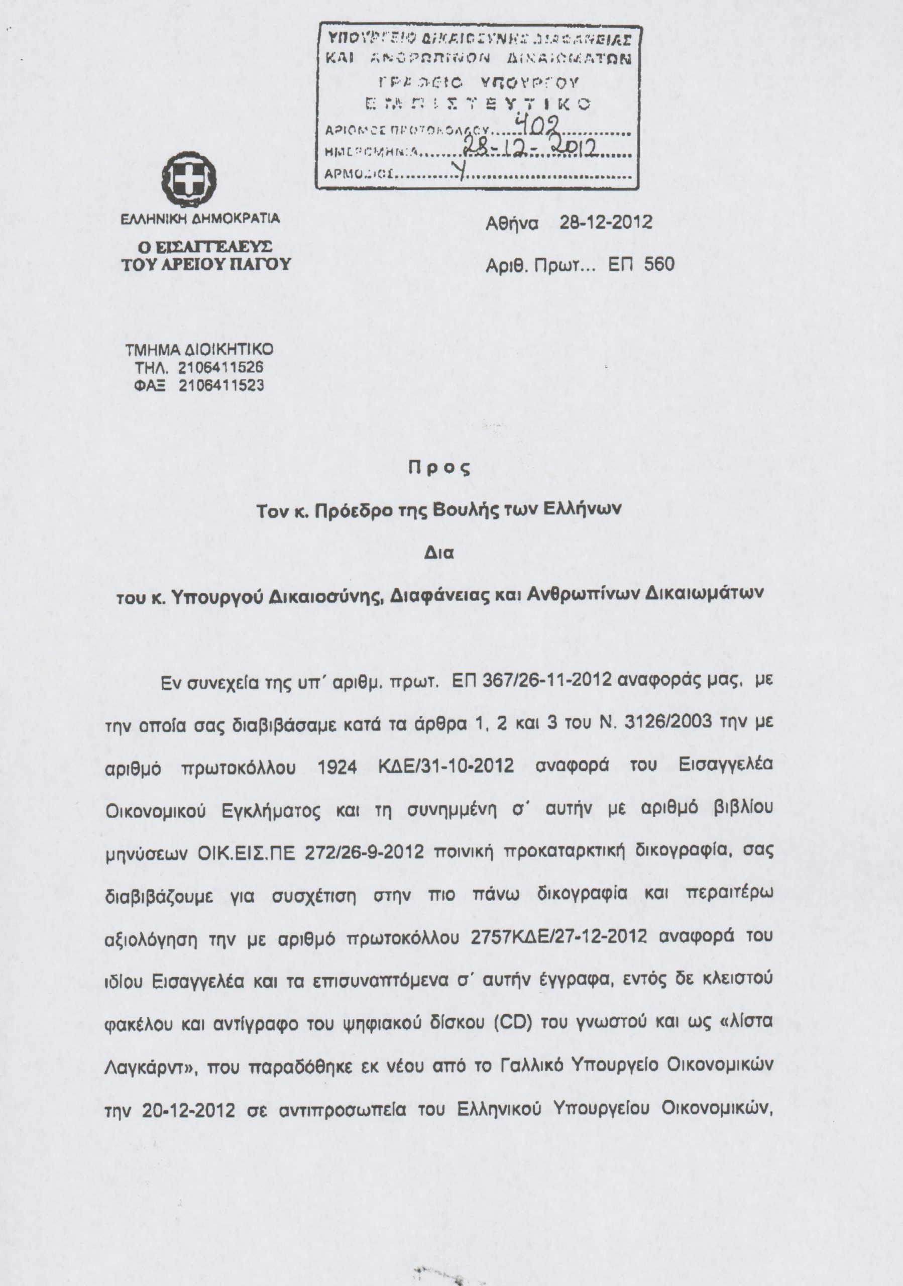 Στη νομοθετική υπηρεσία της βουλής βρίσκεται ήδη ο φάκελος με την αυθεντική «λίστα Λαγκάρντ» και το πόρισμα των οικονομικών Εισαγγελέων σχετικά με το θέμα της αλλοίωσης της λίστας,