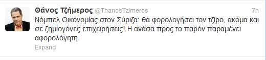 Επίθεση στον ΣΥ.ΡΙΖ.Α. αναφορικά με τις θέσεις του στον τομέα της οικονομίας, έκανε μέσω Twitter ο επικεφαλής της “Δημιουργίας, Ξανά” Θάνος Τζήμερος.”Νόμπελ Οικονομίας στον ΣΥ.ΡΙΖ.Α.: θα φορολογήσει τον τζίρο, ακόμα και σε ζημιογόνες επιχειρήσεις! Η ανάσα προς το παρόν παραμένει αφορολόγητη”, έγραψε συγκεκριμένα ο κ.Τζήμερος.
