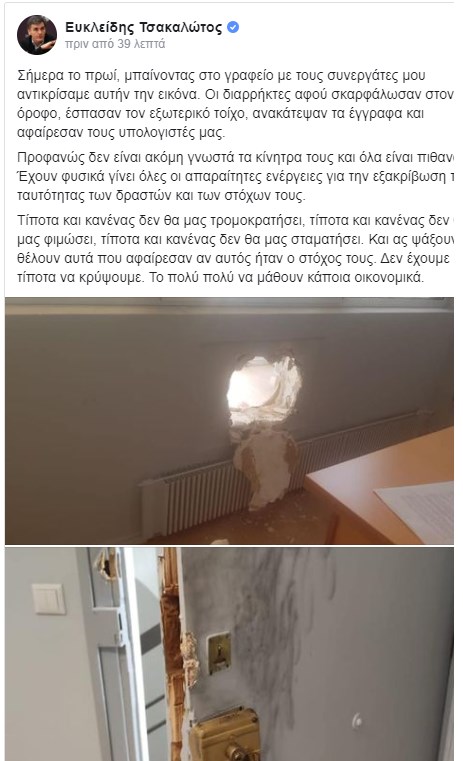 Θύμα διάρρηξης έπεσε ο πρώην υπουργός Οικονομικών επί κυβερνήσεως ΣΥΡΙΖΑ, Ευκλείδης Τσακαλώτος. Άγνωστοι διέρρηξαν το πρωί της Τετάρτης το γραφείο του και έκλεψαν τους ηλεκτρονικούς υπολογιστές του ίδιου αλλά και των συνεργατών του.