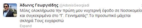 «Μόλις ολοκλήρωσα την πρώτη μου νυχτερινή έφοδο σε Νοσοκομείο και συγκεκριμένα στο “Γ. Γεννηματάς”. Το προσωπικό μάχεται σκληρά. Τους ευχαριστώ», έγραψε συγκεκριμένα.