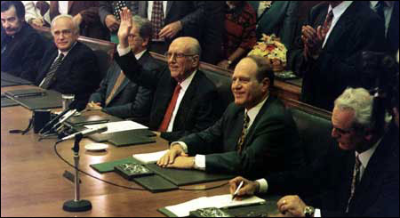 Το 1993 με την επιστροφή του ΠΑ.ΣΟ.Κ. στην εξουσία ανέλαβε υπουργός Εθνικής Άμυνας (13 Οκτωβρίου 1993 – 25 Σεπτεμβρίου 1996). Με την αποχώρηση του Ανδρέα Παπανδρέου από την πολιτική, διεκδίκησε με αξιώσεις την ηγεσία του κόμματος τον Ιανουάριο του 1996, την οποία έχασε από τον Κώστα Σημίτη. Ο Γεράσιμος Αρσένης ήταν αυτός που θεωρούνταν πιο κοντά στον Ανδρέα Παπανδρέου εκείνη την εποχή, παρά την παλαιότερη διαφωνία τους: τόσο ο ίδιος όσο και η σύζυγός του Λούκα Κατσέλη διατηρούσαν πολύ φιλικές σχέσεις με τον ιδρυτή του ΠΑΣΟΚ.