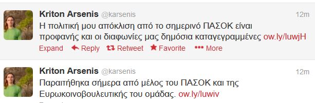 «Η πολιτική μου απόκλιση από το σημερινό ΠΑΣΟΚ είναι προφανής και οι διαφωνίες μας δημόσια καταγεγραμμένες», έγραψε νωρίτερα μέσω Twitter ο Κρίτων Αρσένης ο οποίος υπέβαλε την παραίτησή του από ευρωβουλευτής του ΠΑΣΟΚ αλλά και μέλος του Κινήματος.