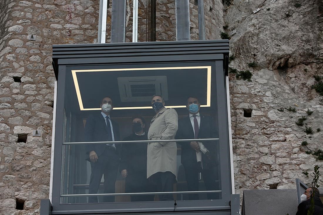 Ακολούθως, ο Κυριάκος Μητσοτάκης μαζί με τη Λίνα Μενδώνη και τον Μανώλη Κορρέ εγκαινίασαν τον ανελκυστήρα και περιηγήθηκαν στις νέες διαδρομές της Ακρόπολης.