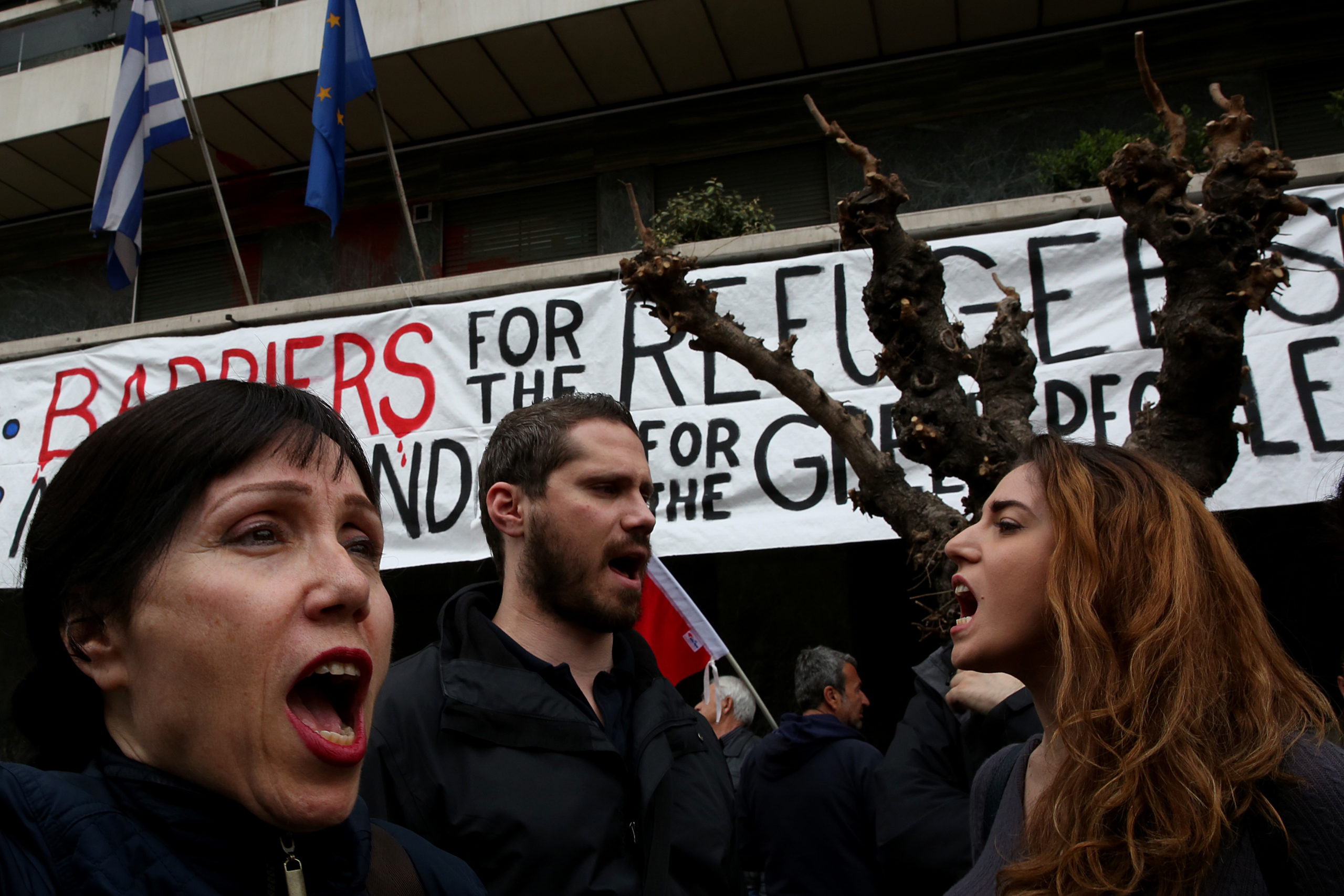 Οι διαδηλωτές κρέμασαν στο μπαλκόνι του κτιρίου ένα πανό στο οποίο ήταν γραμμένο στα αγγλικά το μήνυμα «Φράχτες για τους πρόσφυγες, μνημόνια για τον Ελληνικό λαό» και προχώρησαν στην συμβολική κατάληψη των γραφείων.
