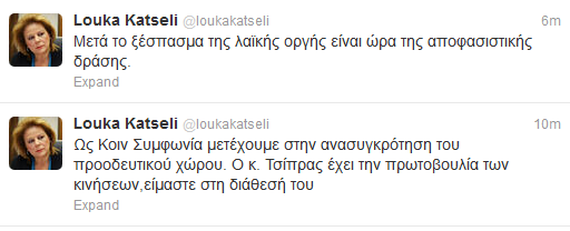“Ως Κοινωνική Συμφωνία μετέχουμε στην ανασυγκρότηση του προοδευτικού χώρου. Ο κ. Τσίπρας έχει την πρωτοβουλία των κινήσεων,είμαστε στη διάθεσή του”, έγραψε πριν από λίγα λεπτά στο Twitter η πρόεδρος της Κοινωνικής Συμφωνίας Λούκα Κατσέλη. “Μετά το ξέσπασμα της λαϊκής οργής είναι ώρα της αποφασιστικής δράσης”, σημείωσε στη συνέχεια.