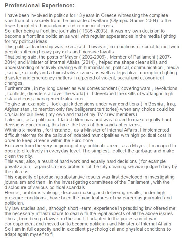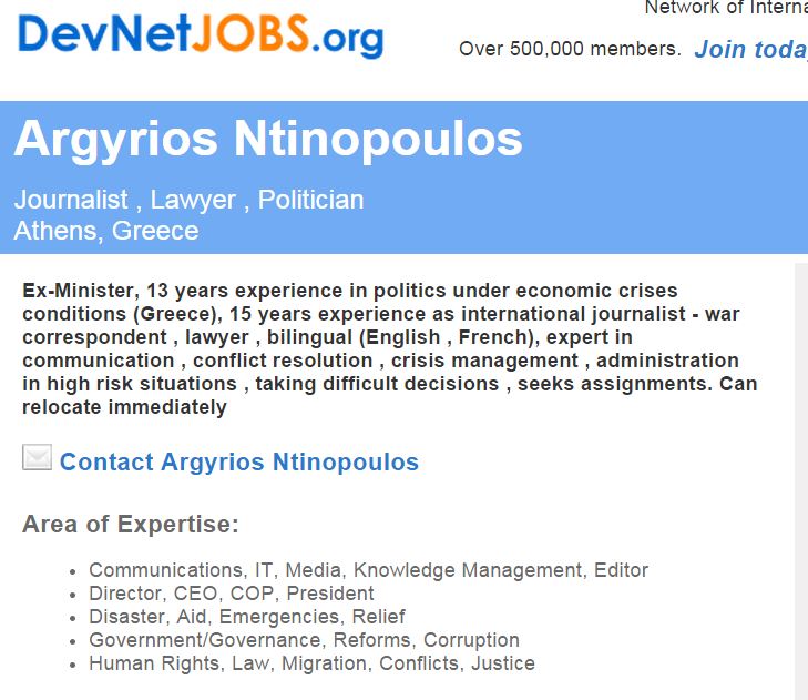 «Πρώην υπουργός, 13 χρόνια εμπειρίας στην πολιτική υπό συνθήκες οικονομικής κρίσης, 15 χρόνια εμπειρίας ως δημοσιογράφος – πολεμικός ανταποκριτής, δικηγόρος, μιλάει αγγλικά και γαλλικά, ειδικός στην επικοινωνία και στη διαχείριση κρίσεων, διοικητικές ικανότητες σε καταστάσεις υψηλού κινδύνου…» είναι μερικά από τα στοιχεία που φέρεται να αναφέρει στην εν λόγω αγγελία ο Αργύρης Ντινόπουλος, προσθέτοντας ότι υπάρχει «η δυνατότητα να μετακομίσει άμεσα».
