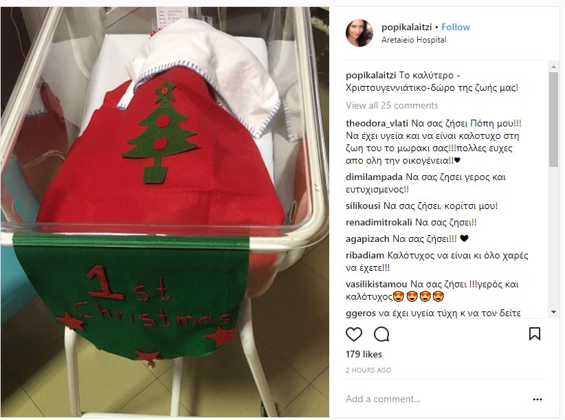 Η σύζυγος του αντιπροέδρου της ΝΔ, Κωστή Χατζηδάκη, Πόπη Καλαϊτζή, ανήρτησε στον προσωπικό της λογαριασμό στο instagram την πρώτη φωτογραφία του νεογέννητου γιού τους με τη λεζάντα “Το καλύτερο -Χριστουγεννιάτικο-δώρο της ζωής μας!”.
