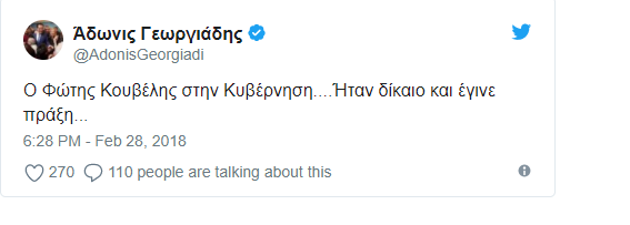 «Ο Φώτης Κουβέλης στην Κυβέρνηση….Ήταν δίκαιο και έγινε πράξη…», ήταν το σχόλιο του Αδωνι Γεωργιάδη στο twitter.