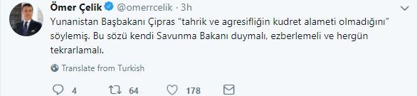 Στην ανάρτησή του ο κ. Τσελίκ ανέφερε ότι «ο Έλληνας Πρωθυπουργός είπε ότι «η κίνηση και επιθετικότητα δεν αποτελούν ένδειξη ισχύος», ο υπουργός Άμυνας θα πρέπει να ακούσει αυτή την φράση, να την απομνημονεύσει και να την επαναλαμβάνει κάθε μέρα».
