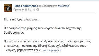 Την έκρηξη του Πάνου Καμμένου προκάλεσε το θέμα που έχει δημιουργηθεί με τον πολιτευτή της Νέας Δημοκρατίας στην Αχαΐα, Γιάννη Δριμάλα, αναφορικά με τον απαράδεκτο σχολιασμό που φέρεται να έχει κάνει στο facebook για τις αυτοκτονίες συμπολιτών μας.”Είστε πιά ξεφτυλισμένοι», έγραψε ο πρόεδρος των Ανεξάρτητων Ελλήνων στην προσωπική σελίδα στο Facebook και πρόσθεσε: “Η προσβολή της μνήμης των νεκρών είναι το έσχατο της βαρβαρότητας. Πουλήσατε τα πάντα για την εξουσία γίνατε συνέταιροι με τους απατεώνες, πουλάτε την Εθνική Κυριαρχία, εξαθλιώνετε τους Έλληνες, βεβηλώνετε και νεκρούς. ΤΕΛΕΙΩΣΑΤΕ ΚΑΤΑΛΑΒΕΤΕ ΤΟ.