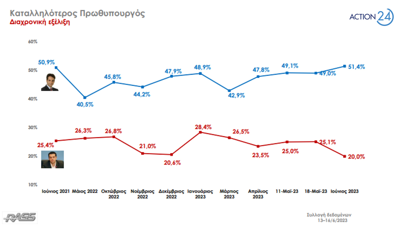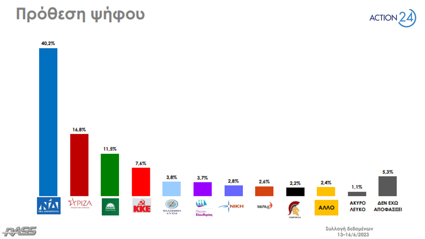 Σύμφωνα με τα αποτελέσματα της έρευνας της εταιρείας RASS για λογαριασμό του Action24, στην πρόθεση ψήφου η Νέα Δημοκρατία προηγείται με 40,2% έναντι 16,8% του ΣΥΡΙΖΑ. Ακολουθούν το ΠΑΣΟΚ με 11,5%, το ΚΚΕ με 7,6%, η Ελληνική Λύση με 3,8%, η Πλεύση Ελευθερίας με 3,7%, η Νίκη με 2,8% και το ΜέΡΑ25 λαμβάνουν 2,6%.