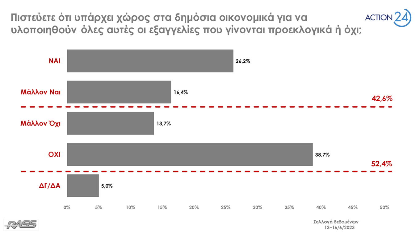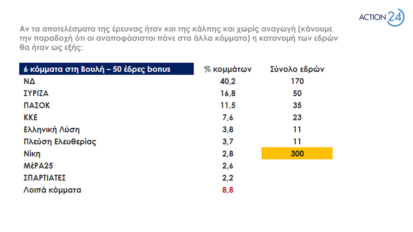 Σύμφωνα με τα αποτελέσματα της έρευνας της εταιρείας RASS για λογαριασμό του Action24, στην πρόθεση ψήφου η Νέα Δημοκρατία προηγείται με 40,2% έναντι 16,8% του ΣΥΡΙΖΑ. Ακολουθούν το ΠΑΣΟΚ με 11,5%, το ΚΚΕ με 7,6%, η Ελληνική Λύση με 3,8%, η Πλεύση Ελευθερίας με 3,7%, η Νίκη με 2,8% και το ΜέΡΑ25 λαμβάνουν 2,6%.