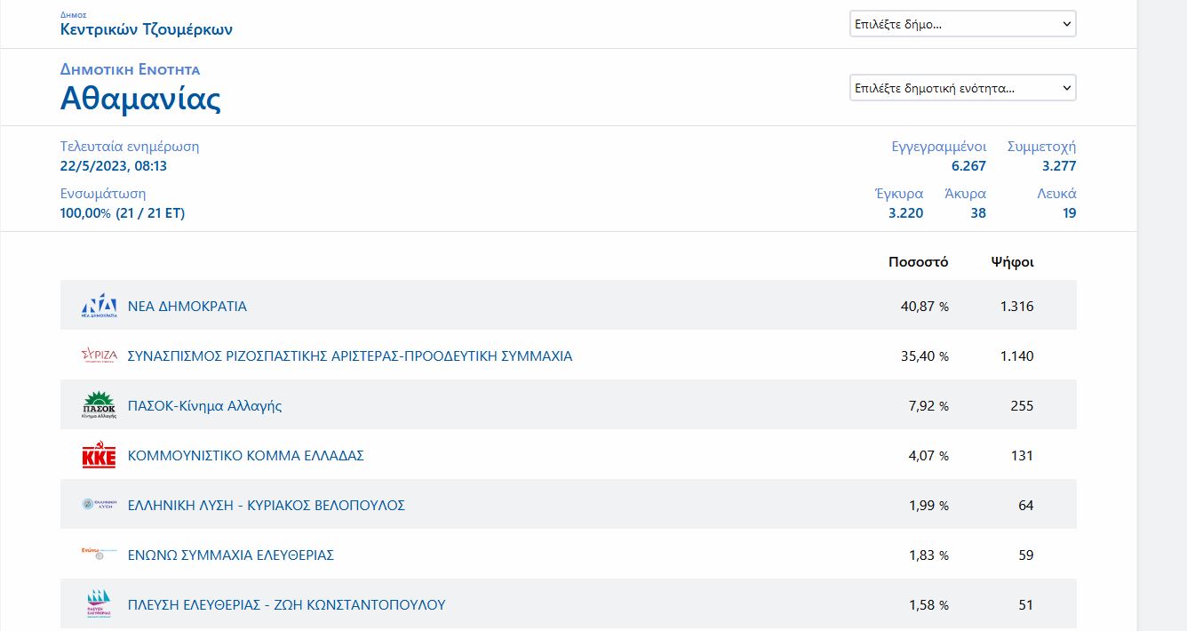 Στη δημοτική ενότητα Αθαμανίας Άρτας η ΝΔ μετά την ολοκλήρωση της καταμέτρησης των ψήφων συγκέντρωσε το 40,87% έναντι 35,40% του ΣΥΡΙΖΑ. Τα ποσοστά του ΣΥΡΙΖΑ στην δημοτική ενότητα ήταν ανεβασμένα σε σχέση με την υπόλοιπη χώρα, ωστόσο ο στόχος της πρωτιάς δεν επετεύχθη.