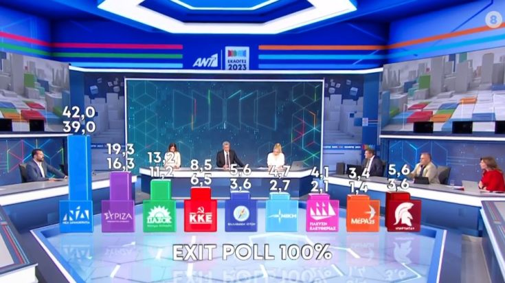 Σύμφωνα με το επικαιροποιημένο exit poll, η Νέα Δημοκρατία συγκεντρώνει ποσοστό από 39% έως 42%, ο ΣΥΡΙΖΑ από 16,3% έως 19,3%, το ΠΑΣΟΚ από 11,2% έως 13,2%, το ΚΚΕ από 6,5% έως 8,5%, η Ελληνική Λύση από 3,6% έως 5,6%, οι Σπαρτιάτες από 3,6% έως 5,6%.