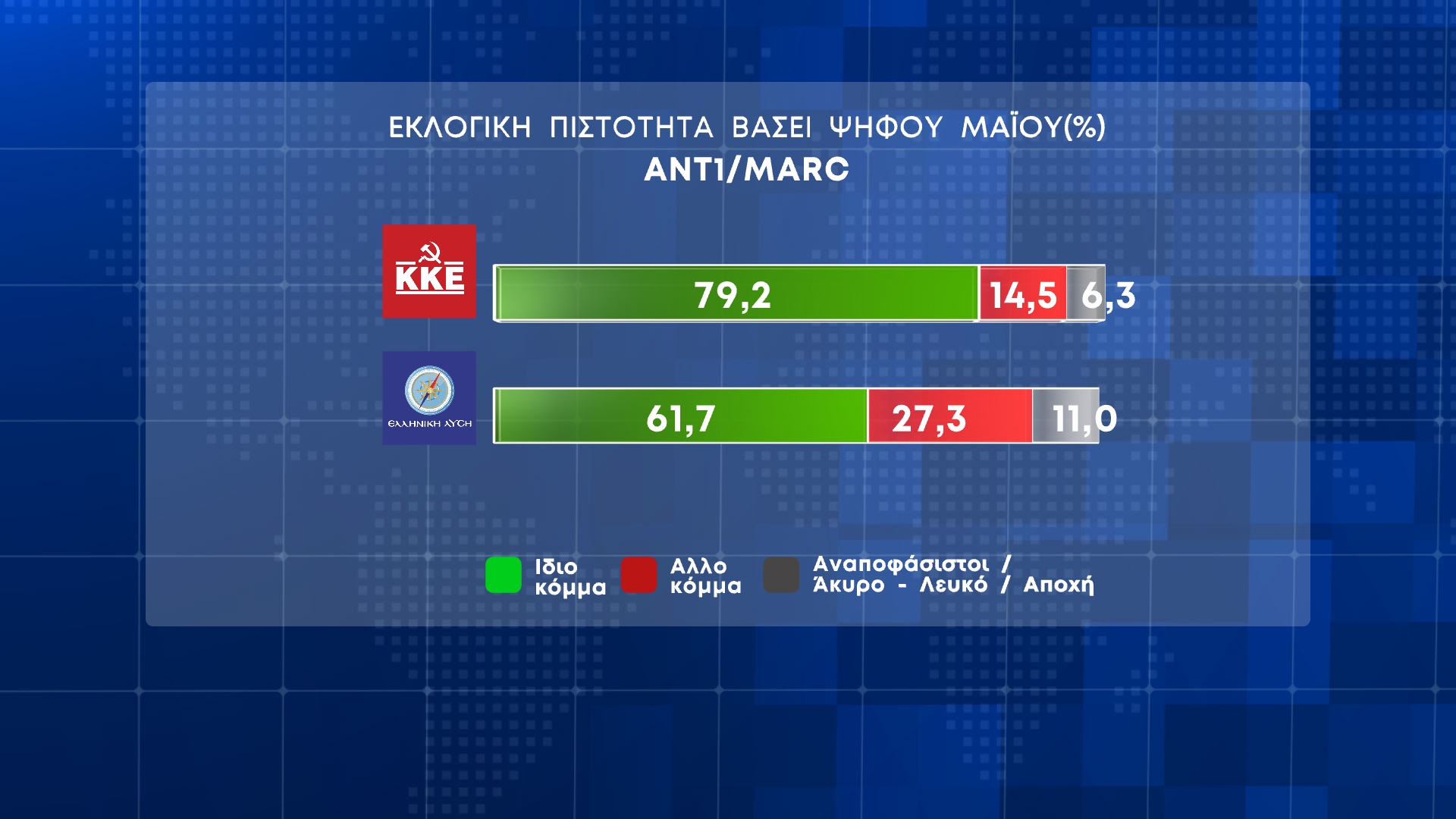 Η δημοσκόπηση της MARC για λογαριασμό του ΑΝΤ1 παρουσιάστηκε σήμερα στο κεντρικό δελτίο ειδήσεων του σταθμού, με τον Νίκο Χατζηνικολάου.