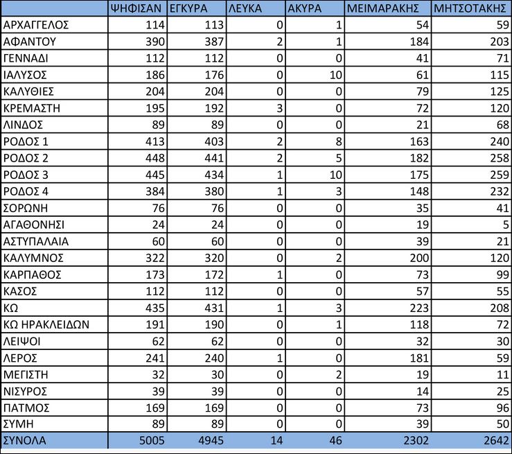 Ο Κυριάκος Μητσοτάκης επικράτησε του Βαγγέλη Μεϊμαράκη στα Δωδεκάνησα. Συγκεκριμένα ο πρώτος έλαβε 2642 ψήφους, έναντι 2302 του δεύτερου.