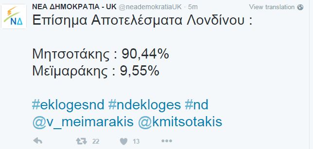 Επίσημα Αποτελέσματα Λονδίνου : Μητσοτάκης : 90,44% Μεϊμαράκης : 9,55%.