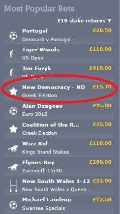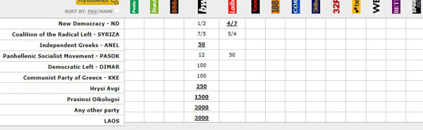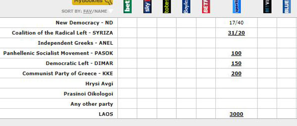 “Δίνουν και παίρνουν” τα στοιχήματα στη Μεγάλη Βρετανία για τις ελληνικές εκλογές.Οι “παίκτες” στοιχηματίζουν σε λίρες και οι αποδόσεις σε μερικές περιπτώσεις κομμάτων που βρίσκονται εκτός κοινοβουλίου ή έλαβαν μικρά ποσοστά στις περασμένες εκλογές, είναι πολύ μεγάλες.