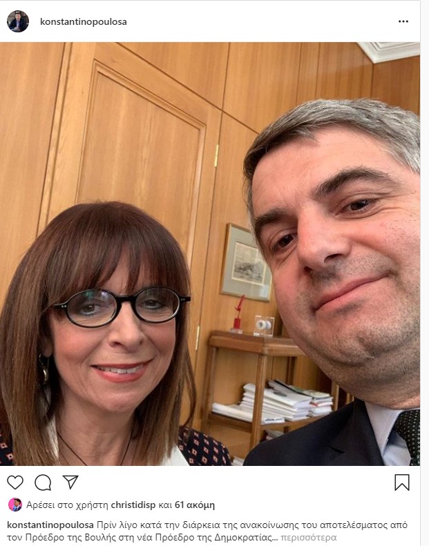 Ο βουλευτής του ΚΙΝΑΛ, Οδυσσέας Κωνσταντινόπουλος, δεν έχασε την ευκαιρία να βγάλει μια φωτογραφία selfie με την νεοεκλεγείσα Πρόεδρο της Δημοκρατίας, Αικατερίνη Σακελλαροπούλου.