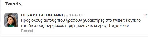 “Προς όλους αυτούς που γράφουν χυδαιότητες στο twitter: κάντε το στο δικό σας περιβάλλον. Μη μολύνετε και εμάς.Ευχαριστώ”, έγραψε πριν από λίγο.