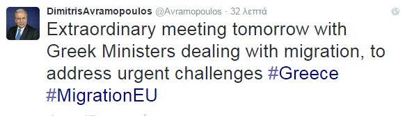 Έκτακτη σύσκεψη με Έλληνες υπουργούς, θα πραγματοποιηθεί την Πέμπτη, ώστε να αντιμετωπιστούν οι νέες προκλήσεις για το μεταναστευτικό, ανακοίνωσε ο Επίτροπος της ΕΕ Δημήτρης Αβραμόπουλος, μέσω του προσωπικού του λογαριασμού στο Twitter.