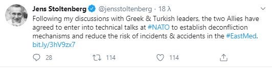 Όπως ανακοίνωσε ο Στόλτενμπεργκ μέσω Twitter, έπειτα από συζητήσεις που είχε με τις ηγεσίες των δύο χωρών, υπήρξε συμφωνία να ξεκινήσουν συζητήσεις μεταξύ τεχνικών κλιμακίων, με στόχο την αποφυγή συγκρούσεων και τη μείωση του κινδύνου περιστατικών και ατυχημάτων στην ανατολική Μεσόγειο.