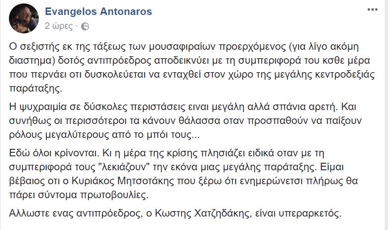 Ο Ευάγγελος Αντώναρος έγραψε το απόγευμα του Σαββάτου στο facebook: