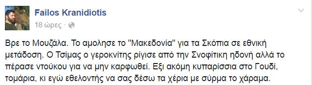 “Βρε το Μουζάλα. Το αμόλησε το “Μακεδονία” για τα Σκόπια σε εθνική μετάδοση. Ο Τσίμας ο γεροκνίτης ρίγισε από την Σνοφίτικη ηδονή αλλά το πέρασε ντούκου για να μην καρφωθεί. Εξι ακόμη κυπαρίσσια στο Γουδί, τομάρια, κι εγώ εθελοντής να σας δέσω τα χέρια με σύρμα το χάραμα”.
