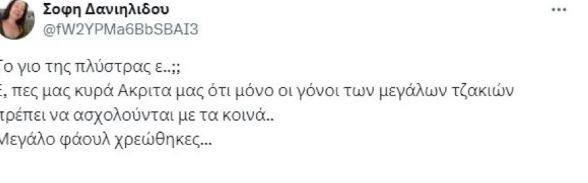 Η ανάρτηση προκάλεσε «βροχή» σχολίων από χρήστες του Twitter. Χρήστης αναφέρει: «Ειλικρινής η κυρία Ακρίτα. Η τάξη της από το 1789 έχει κάθε λόγο να φοβάται τα παιδιά της πλύστρας».