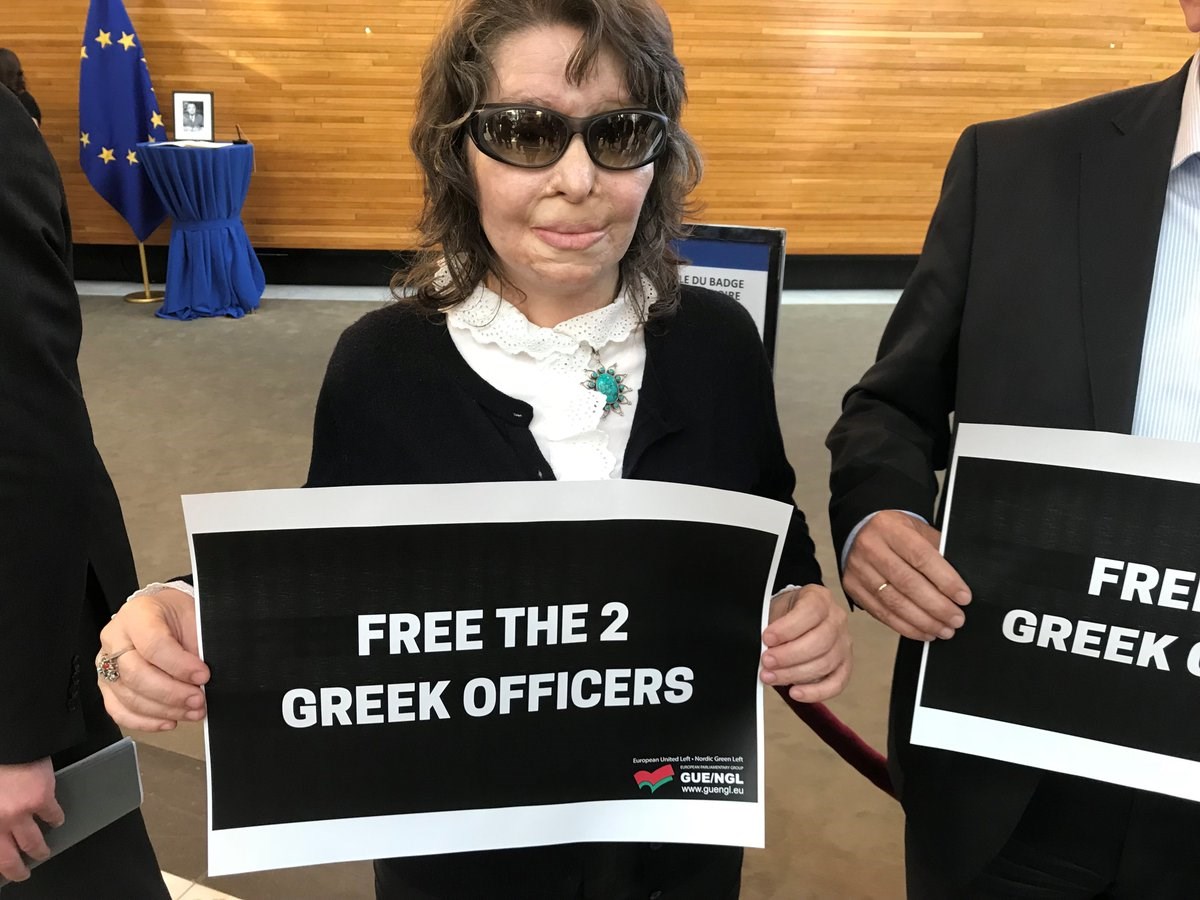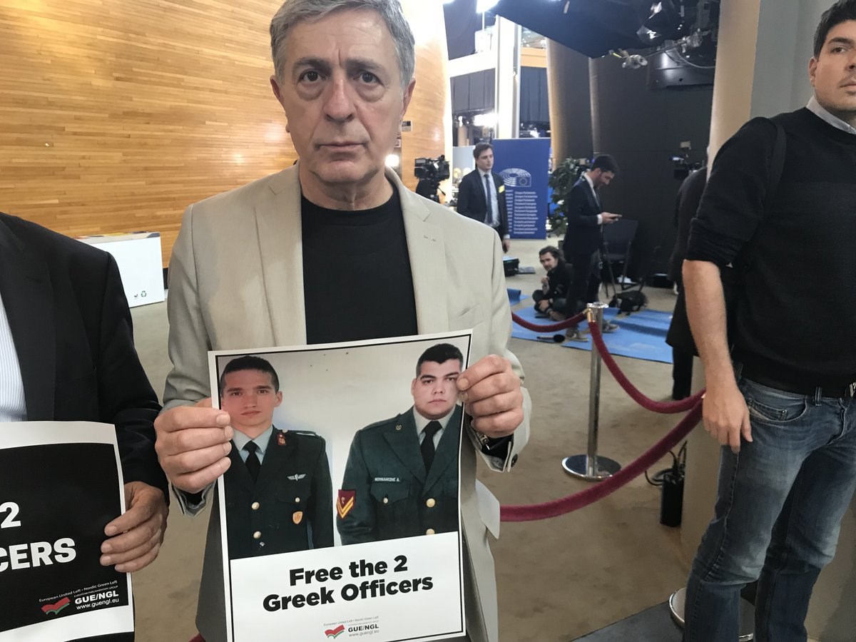 Λίγο πριν από τη σημερινή έναρξη της απογευματινής ψηφοφορίας στην Ολομέλεια της Συνόδου στο Ευρωκοινοβούλιο στο Στρασβούργο, Έλληνες ευρωβουλευτές συγκεντρώθηκαν εντός της αίθουσας κρατώντας φωτογραφίες των δύο Ελλήνων στρατιωτικών ως ένδειξη διαμαρτυρίας για την κράτησή τους από τις τουρκικές αρχές άνευ βάσιμων κατηγοριών, όπως λένε.