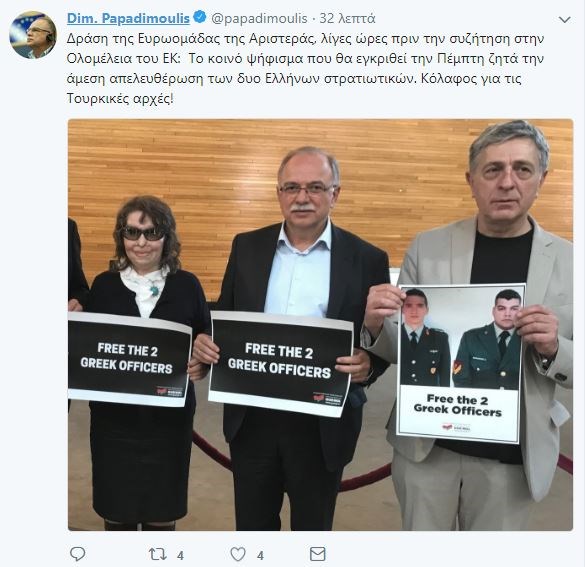 Εν τω μεταξύ σε ανάρτησή του στο twitter ο αντιπρόεδρος του Ευρωκοινοβουλίου και επικεφαλής της ευρωομάδας του ΣΥΡΙΖΑ Δημήτρης Παπαδημούλης ανέφερε τα εξής: «Δράση της Ευρωομάδας της Αριστεράς, λίγες ώρες πριν από την συζήτηση στην Oλομέλεια του ΕΚ: Το κοινό ψήφισμα που θα εγκριθεί την Πέμπτη ζητά την άμεση απελευθέρωση των δυο Ελλήνων στρατιωτικών. Κόλαφος για τις τουρκικές αρχές!»