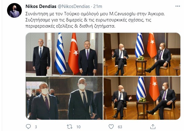 Η ατζέντα των επαφών Δένδια-Τσαβούσογλου επικεντρώθηκε στις διμερείς, αλλά και στις ευρωτουρκικές σχέσεις με τον κ. Δένδια σε ανάρτησή του στον λογαριασμό στο Twitter να αναφέρει: «Συνάντηση με τον Τούρκο ομόλογό μου M. Cavusoglu στην Άγκυρα. Συζητήσαμε για τις διμερείς και τις ευρωτουρκικές σχέσεις, τις περιφερειακές εξελίξεις και διεθνή ζητήματα».